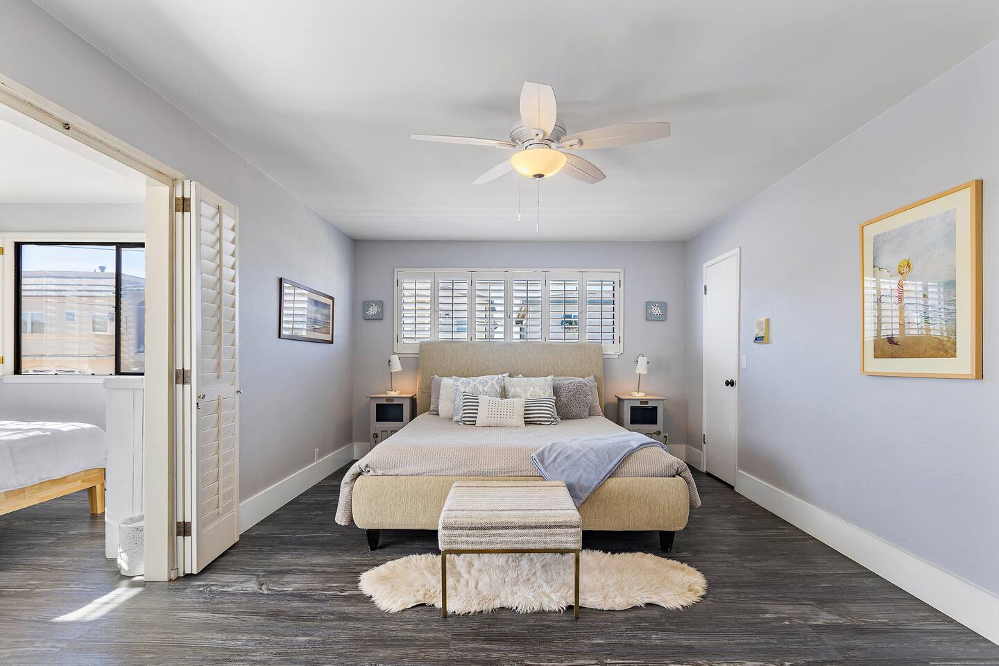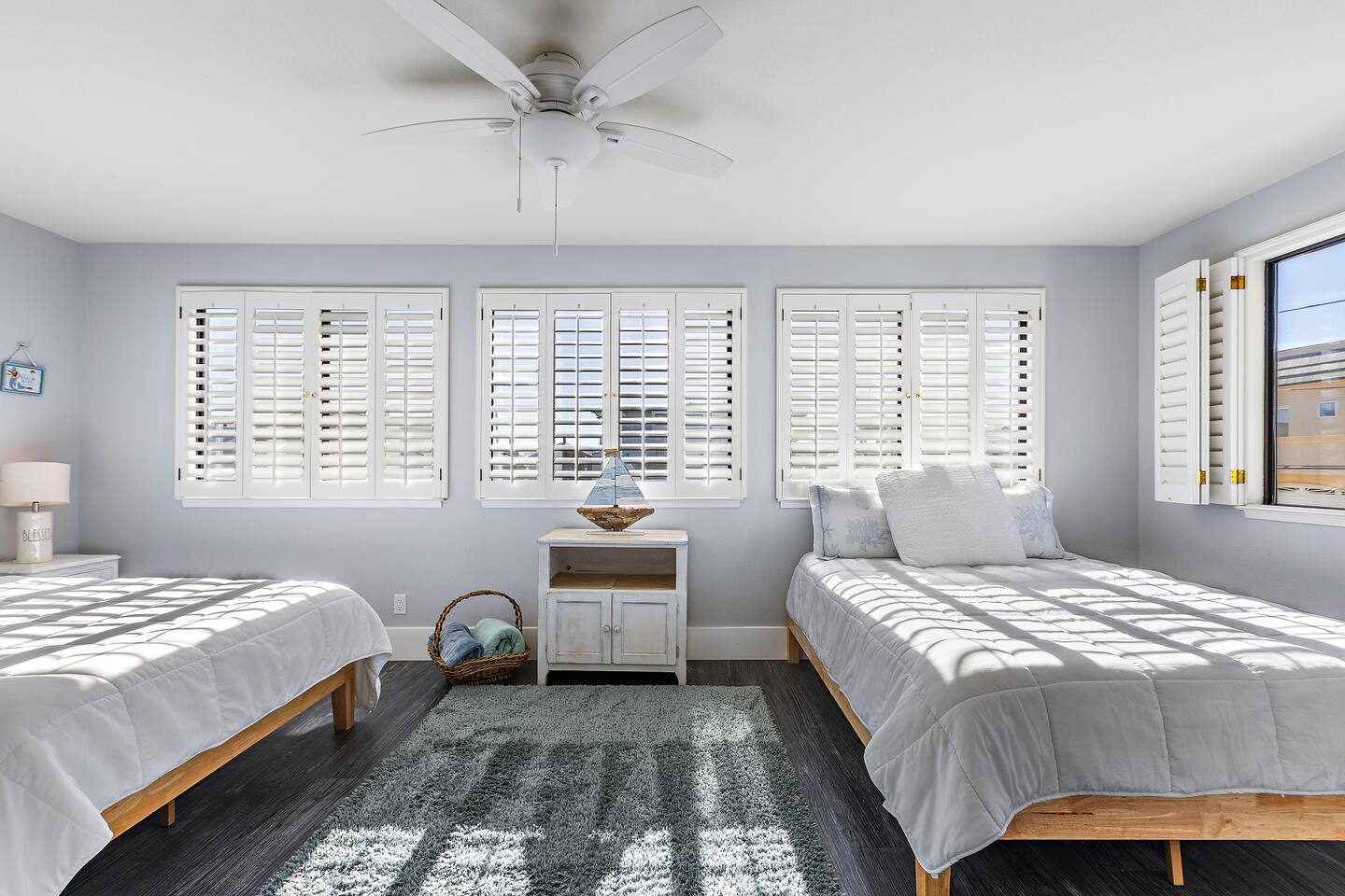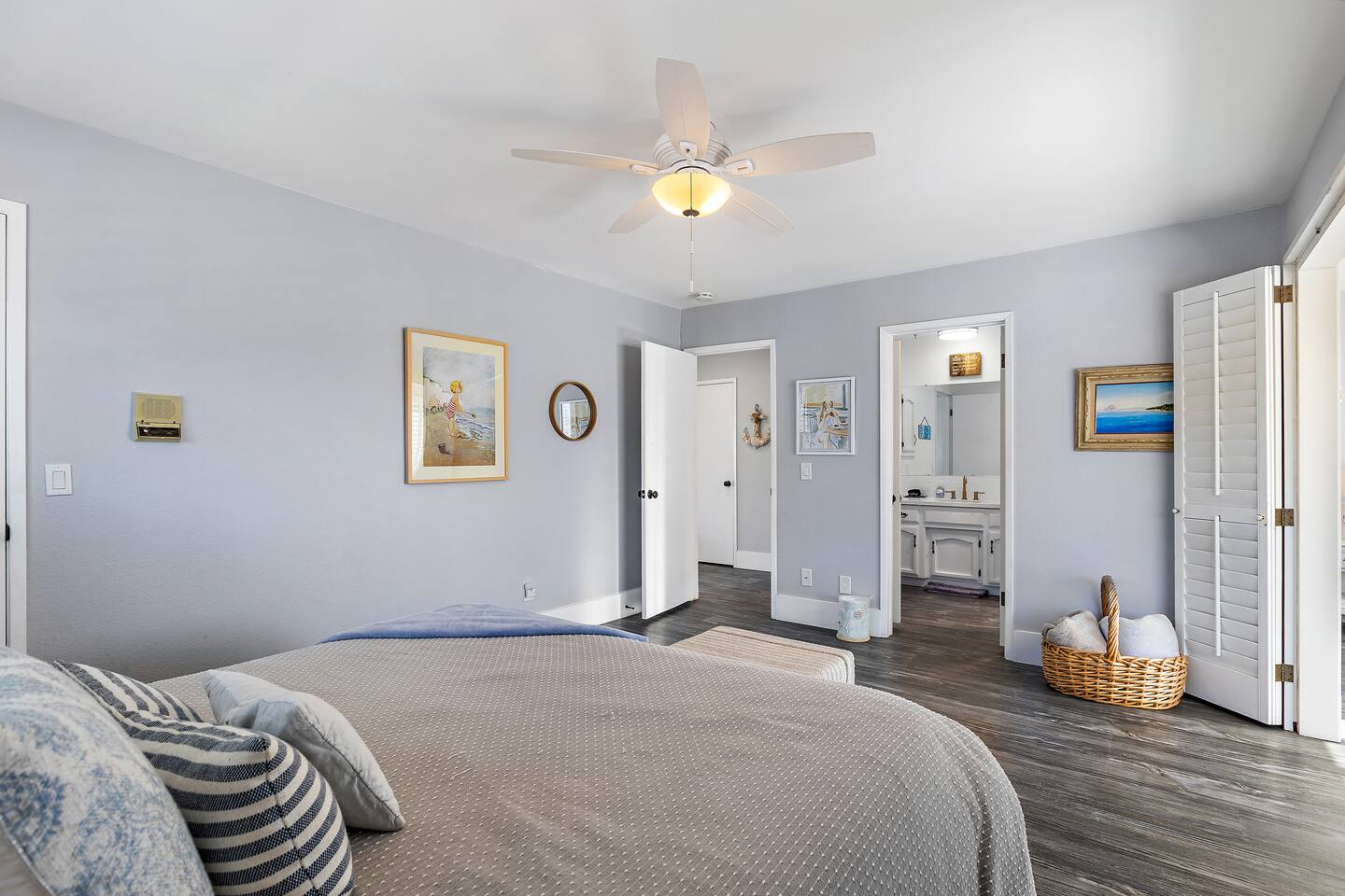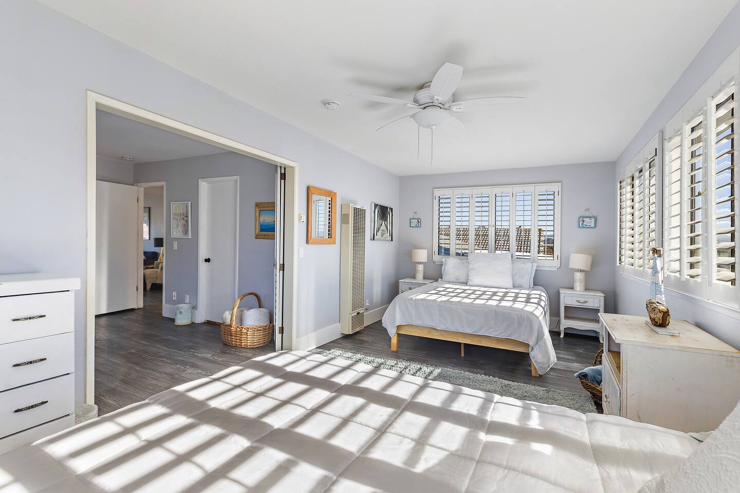 Guests have access to the entire property, including the spacious living areas, ocean-view kitchen, and outdoor deck and yards. There are two Queen bedrooms on the first floor, each with patio/yard access. On the second floor, you'll find the primary bedroom w/ a Cal King bed, adjoining a large bonus bedroom with 2 Queen beds. Floor plans are included in property photos.