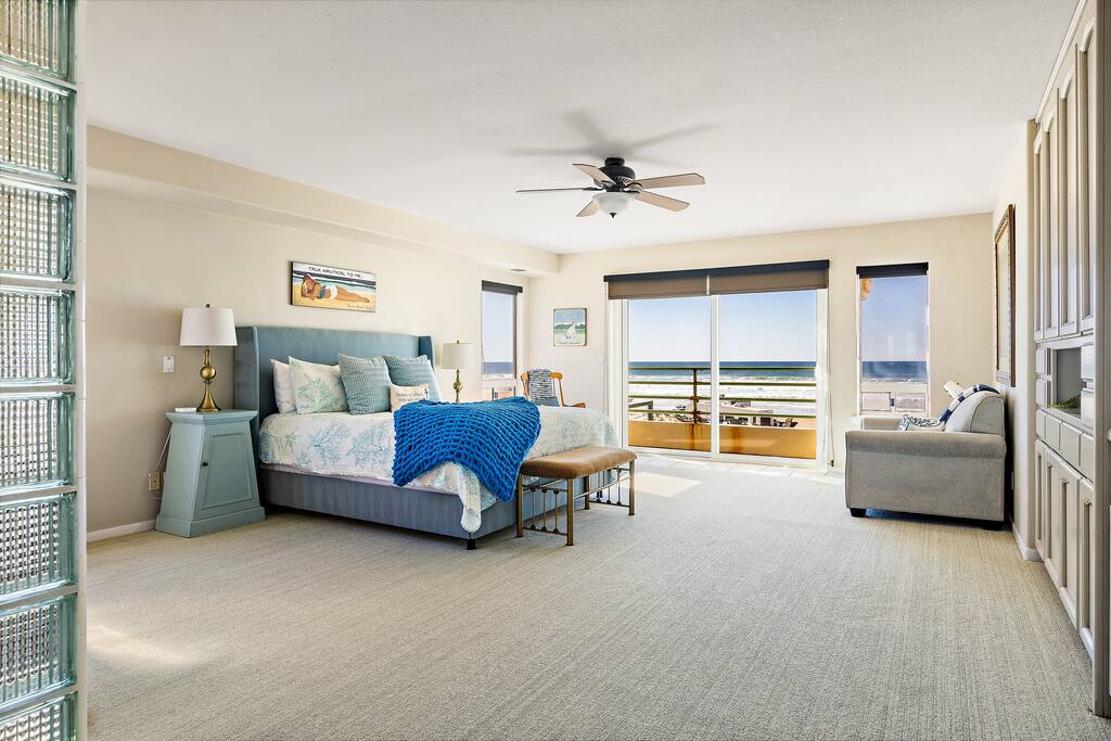Embrace the entire beach as your playground at Strandcastle Beach House. This spacious home features 4 bedrooms, 3 bathrooms, and beachfront access. Both levels boast endless ocean views from the kitchen, 2 living rooms, bedrooms, and dining areas.