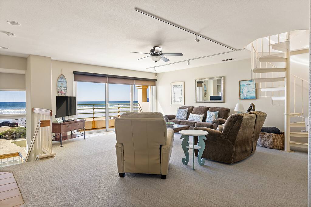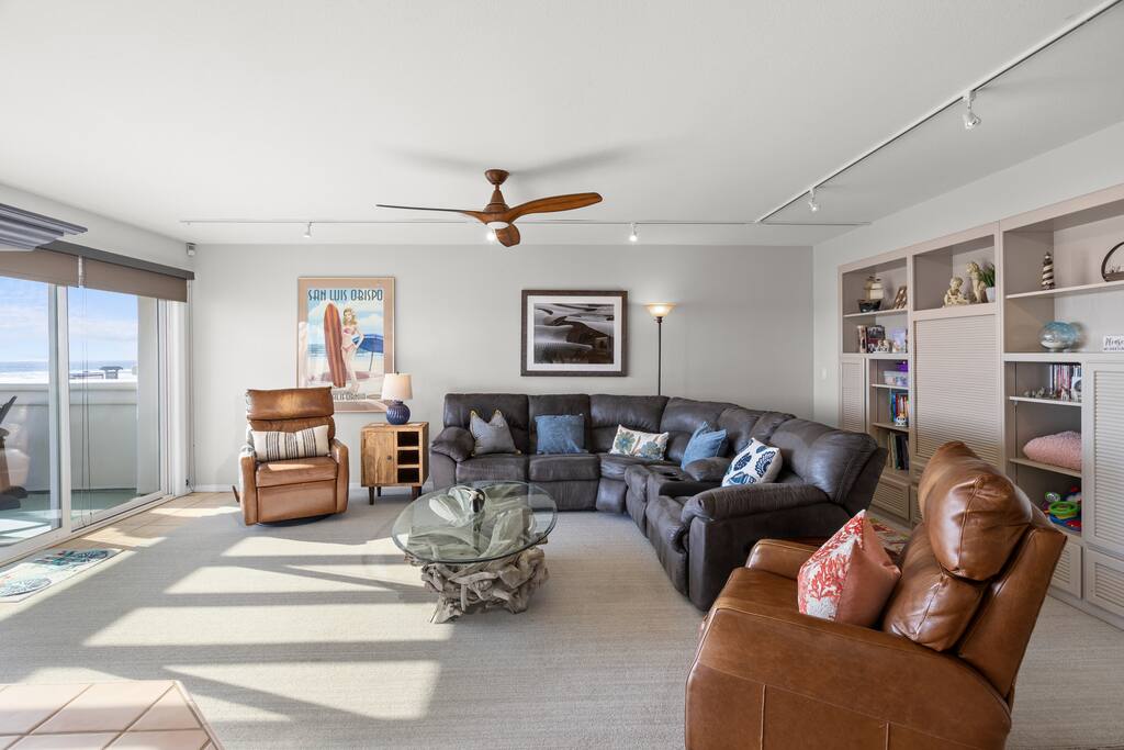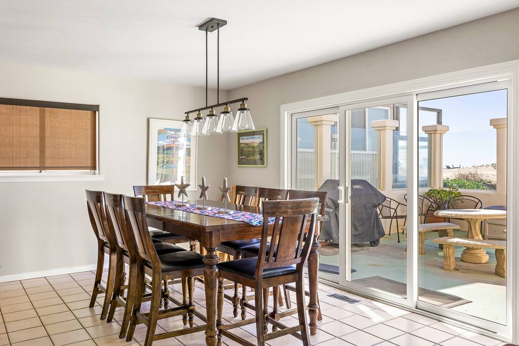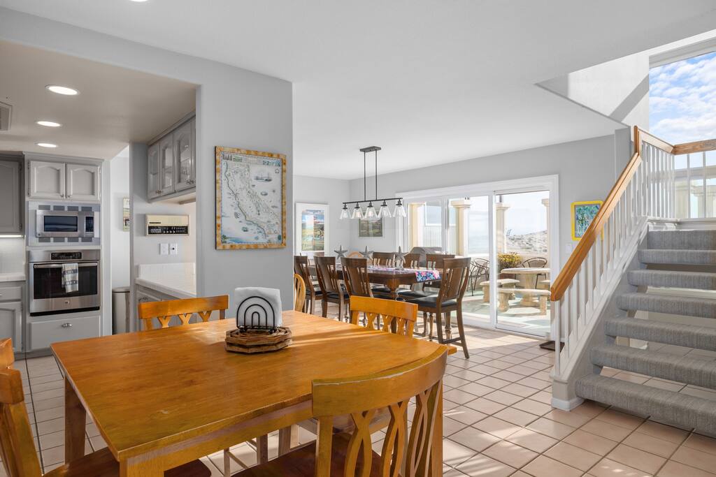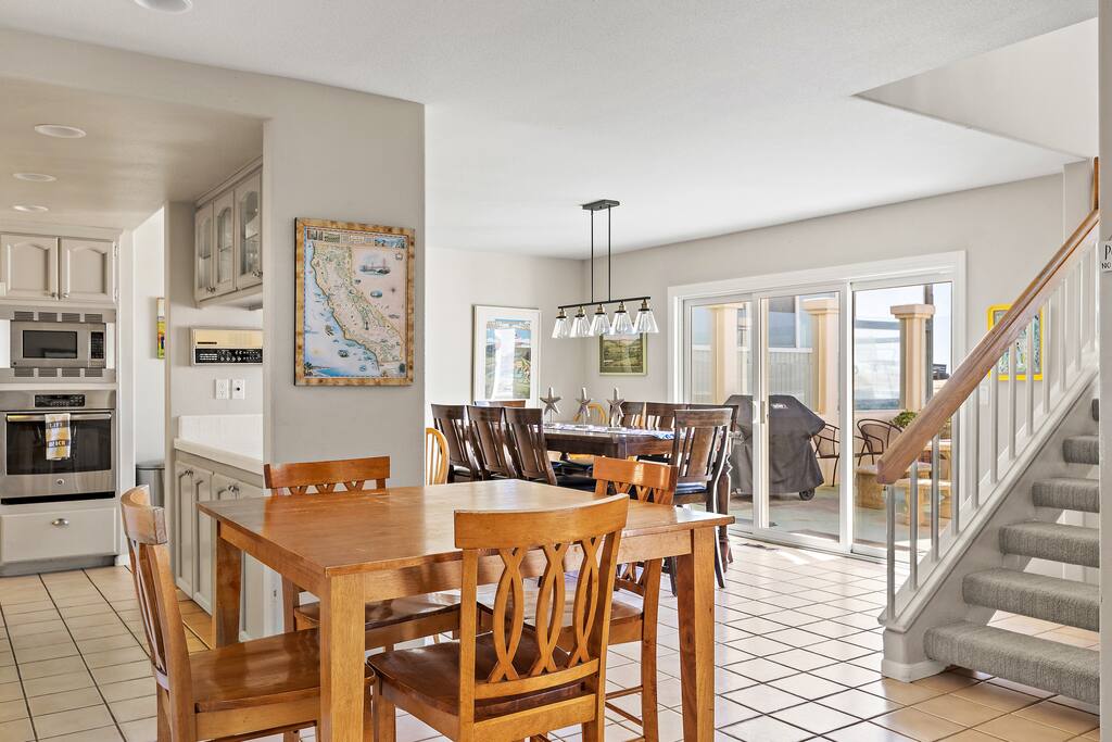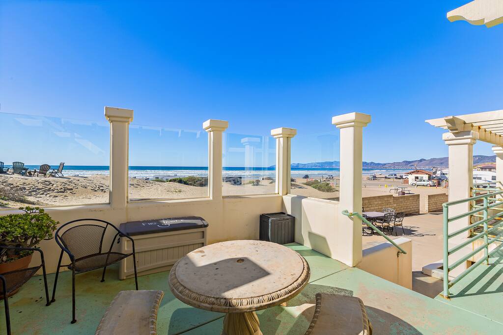 This sprawling oceanfront home is right on the sand, don't settle for less! The Strandcastle boasts magnificent views of the white sand, Oceano dunes, and gorgeous blue Pacific Ocean from the floor-to-ceiling windows throughout. The Strand is a very special strip of homes right on the beach and it is the ONLY strip of homes on the beach where you can walk out the door onto the sand on the entire Central Coast. There is plenty of room for your families to sprawl out in this 3,120 square foot home with 2 large living rooms, multiple indoor/outdoor dining areas, a gourmet kitchen, a wet bar, 4 large bedrooms, and 3 baths. Discover the laid-back allure of the Central Coast with a seamless blend of coastal delights. Wander along the shoreline to reach Pismo Beach, explore the scenic Oceano dunes and nearby hiking trails, or opt for a leisurely horseback ride. Whether you're renting recreational vehicles or bringing your own, the spirit of adventure awaits. Enjoy renowned dining, explore charming shops, and delve into local museums. A short drive opens up a world of experiences—from Avila Beach, Arroyo Grande Village, and the SLO Farmer's Market to the grandeur of Hearst Castle, vibrant car shows, lively festivals, wine tastings, Cal Poly, Morro Bay, Lopez Lake, and so much more! We extend a warm invitation to bask in the magic of our dreamy beach house and set the stage for what promises to be your BEST vacation ever! Sunset bonfires are permitted on the beach (time for S'mores!) and you only have to walk out the door onto the sand to find your special spot. You will have the entire beach as your own backyard playground. It's so stunning, it's ridiculous! MAIN FLOOR - 2 bedrooms ~ one with 2 bunk beds (3 twins, one full) and one Queen bedroom - Bathroom - Gourmet Kitchen with all you will need to make fabulous meals for your beachside dining ~ no reservations needed! - Large living room that walks out to a beachfront patio ~ cable television, games, books, and more to keep the little ones occupied when you aren't at the beach! - Breakfast nook dining table - Eat-in island with seating - Full dining room that walks out to an outdoor dining space with BBQ grill and beach toys! Don't forget to have the kiddos build a Strandcastle and send us pics! SECOND FLOOR - Private Primary Suite with a Cal King bed and 5-piece en suite bath - Queen Bedroom with private en suite full bath and private balcony - Spacious 2nd living room with wet bar and AMAZING views of the ocean Other Amenities - Panoramic ocean views from 2 balconies and 2 patios - The entire west side of the home has floor-to-ceiling windows ~ you really can't avoid seeing the beach! - Recently upgraded and thoughtfully decorated with a Cali beach vibe throughout - High chair - Hatch Restores and Baby Hatch Rest+ for amazing rest! - Plush towels and bath amenities - 2 car spaces (max) in covered parking garage